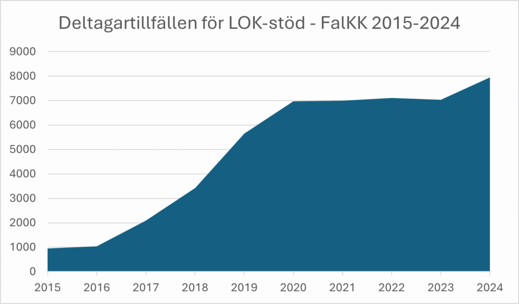 Riksidrottsförbundets statistik över utbetalda LOK-stöd* 2024 i Falkenbergs kommun är också ett kvitto på att vi är en klubb som vuxit rejält – och som fortsätter att växa. I diagrammet nedan syns hur våra LOK-berättigade deltagartillfällen har ökat mellan åren 2013-2024.